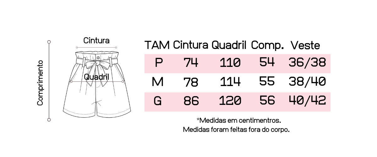 Recomendamos que tenha em mãos suas medidas de busto, cintura e quadril para que possa fazer a comparação com as medidas da peça, pois cada uma tem suas medidas tiradas exclusivamente.