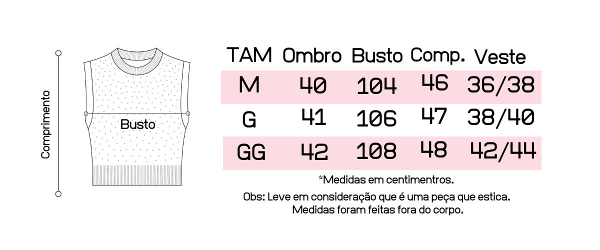 Atente-se as medidas na hora da compra para que receba a sua peça exatamente do tamanho que deseja