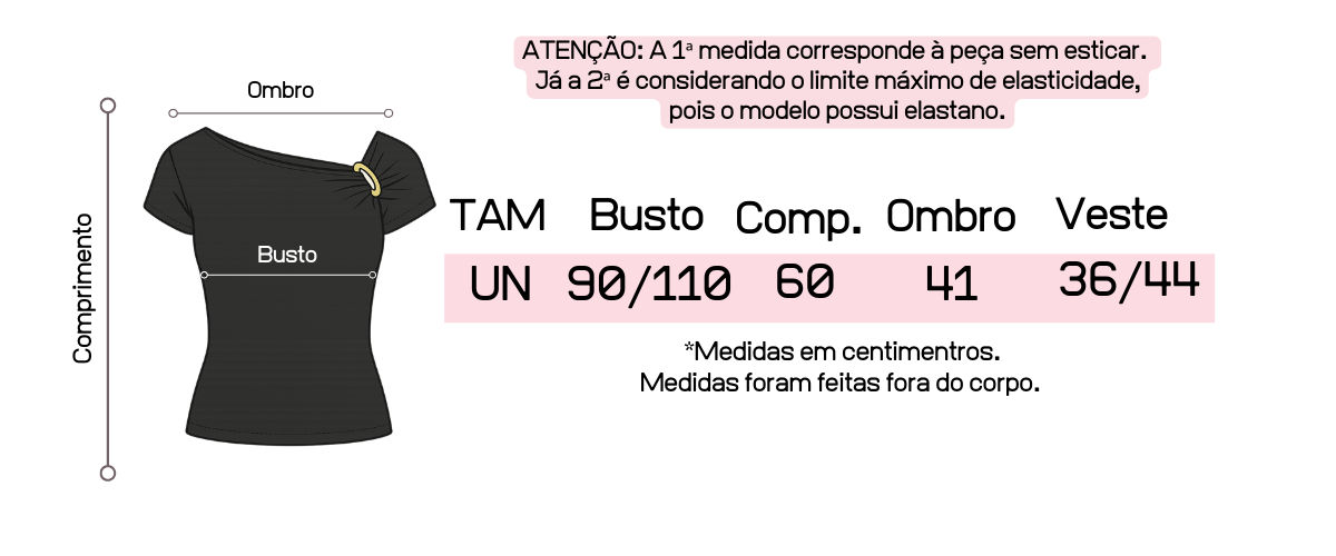 Recomendamos que tenha em mãos suas medidas de busto, cintura e quadril para que possa fazer a comparação com as medidas da peça, pois cada uma tem suas medidas tiradas exclusivamente.