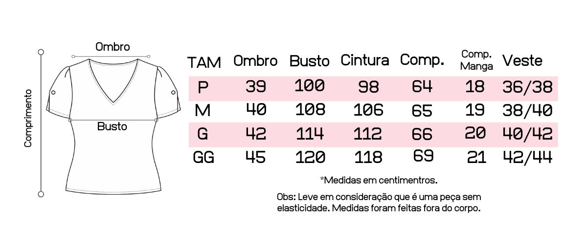 Atente-se as medidas na hora da compra para que receba a sua peça exatamente do tamanho que deseja