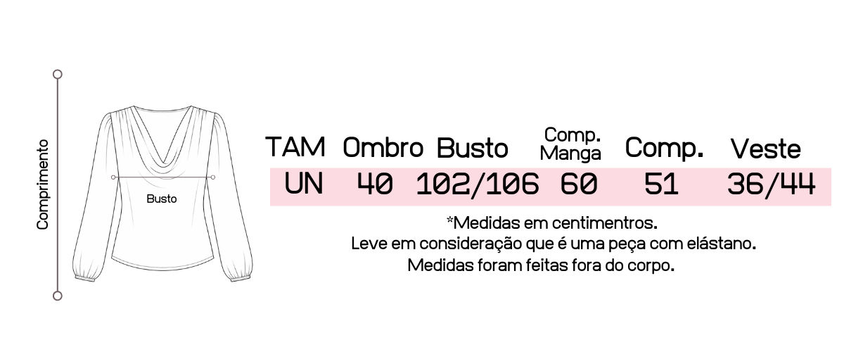 O decote drapeado cria um efeito fluido e elegante na região do colo, sem marcar e com caimento impecável. As mangas longas com leve franzido no punho trazem um toque delicado e sofisticado ao visual.