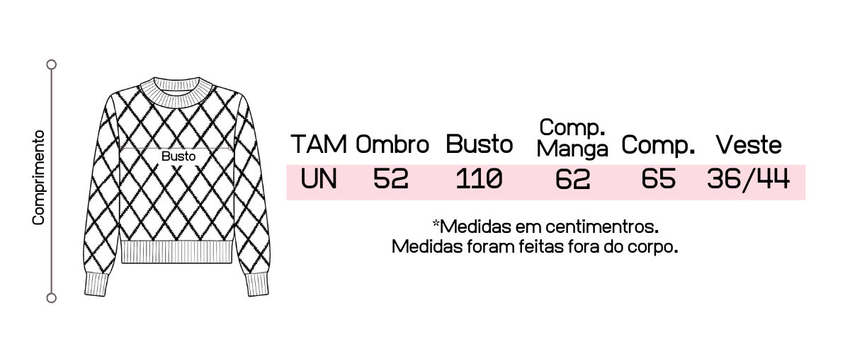 Atente-se as medidas na hora da compra para que receba a sua peça exatamente do tamanho que deseja