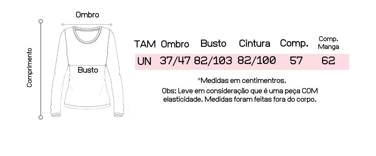 | Tecido | Manga longa; Decote em V; Tecido tricot modal canelado. |