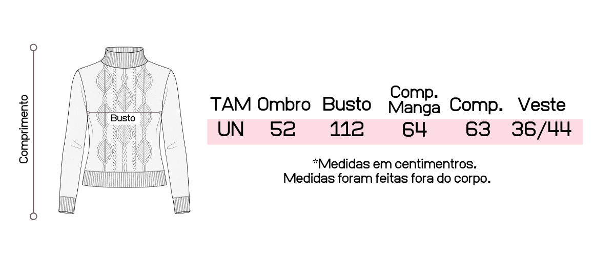 Atente-se as medidas na hora da compra para que receba a sua peça exatamente do tamanho que deseja
