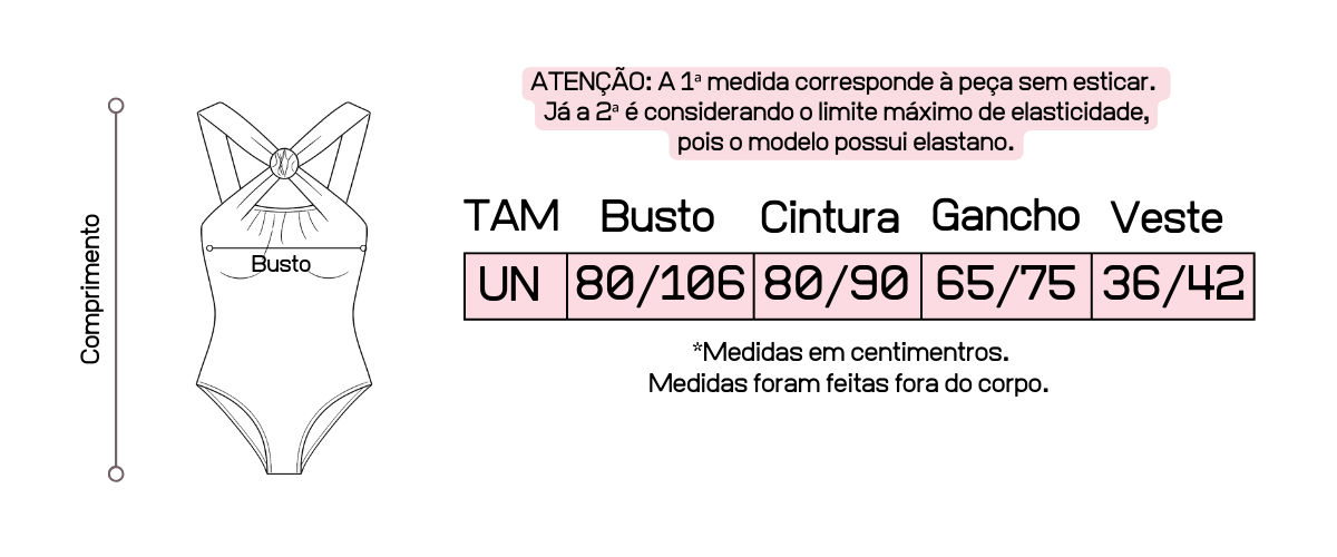 Recomendamos que tenha em mãos suas medidas de busto, cintura e quadril para que possa fazer a comparação com as medidas da peça, pois cada uma tem suas medidas tiradas exclusivamente.