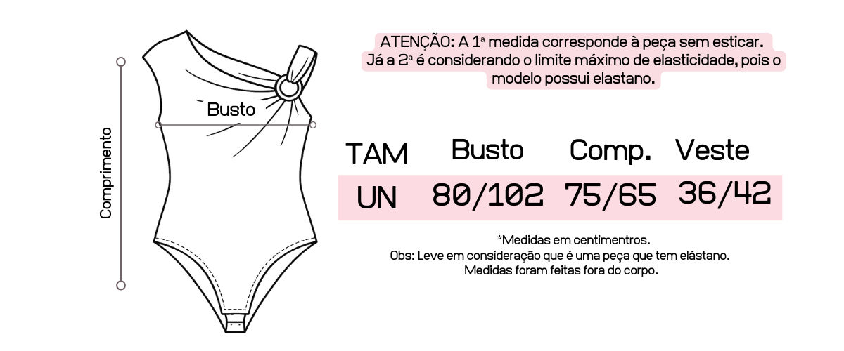Recomendamos que tenha em mãos suas medidas de busto, cintura e quadril para que possa fazer a comparação com as medidas da peça, pois cada uma tem suas medidas tiradas exclusivamente.