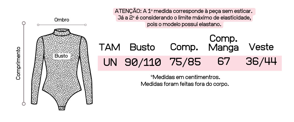 Recomendamos que tenha em mãos suas medidas de busto, cintura e quadril para que possa fazer a comparação com as medidas da peça, pois cada uma tem suas medidas tiradas exclusivamente.