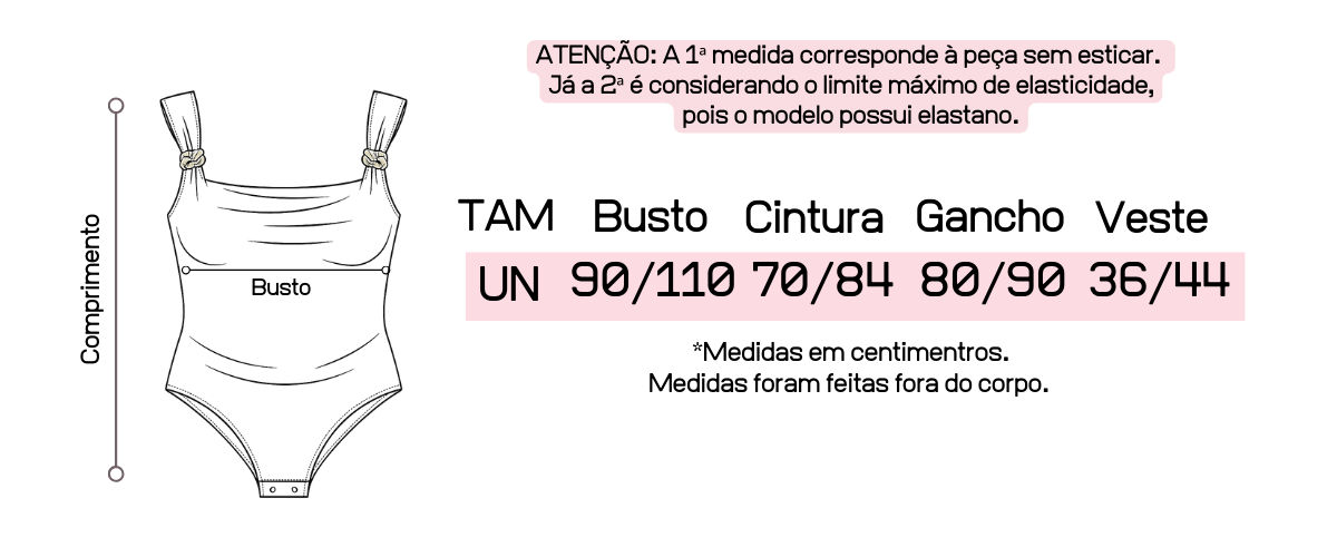 Recomendamos que tenha em mãos suas medidas de busto, cintura e quadril para que possa fazer a comparação com as medidas da peça, pois cada uma tem suas medidas tiradas exclusivamente.