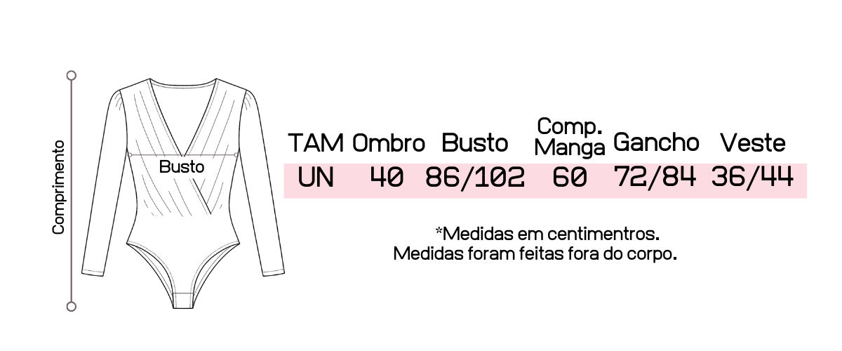 Recomendamos que tenha em mãos suas medidas de busto, cintura e quadril para que possa fazer a comparação com as medidas da peça, pois cada uma tem suas medidas tiradas exclusivamente.