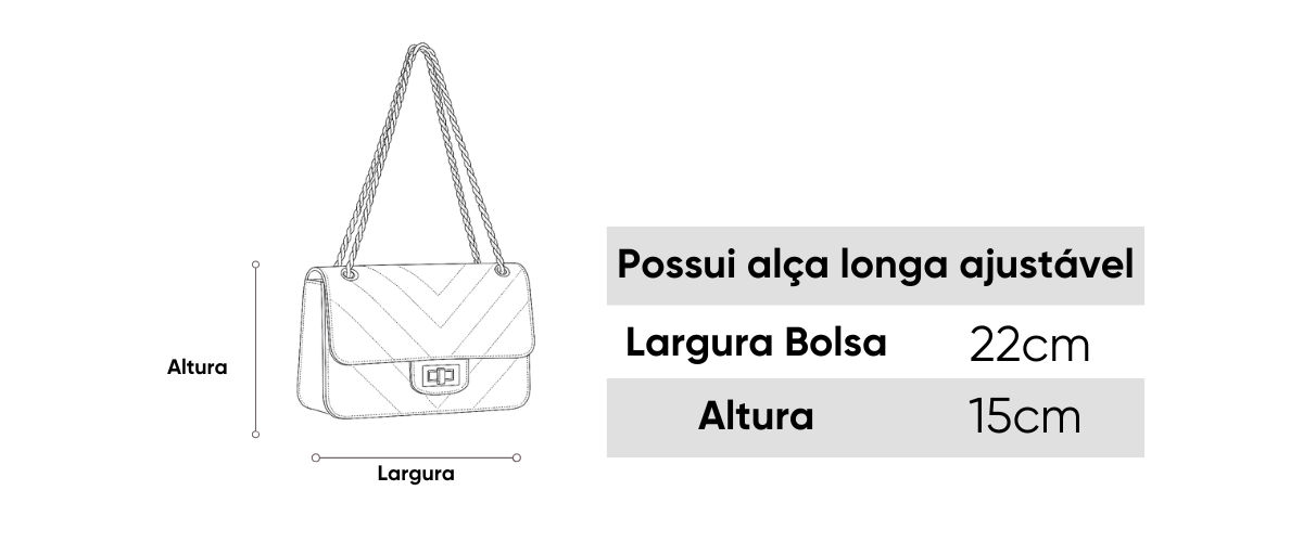 A Joana é a escolha certa para quem ama bolsas compactas com presença. Feita em couro ecológico com acabamento liso e macio, seu grande destaque é o matelassê em costura chevron, que traz um toque moderno e sofisticado à peça.