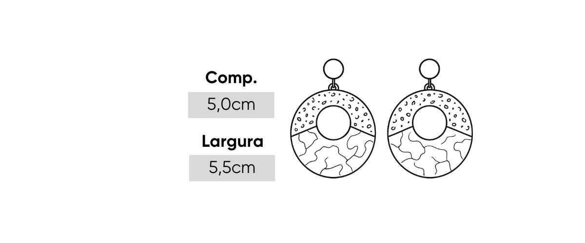 O Brinco Lena é uma joia moderna com design circular e textura marcante. Possui base metálica dourada com acabamento polido e detalhe em resina clara marmorizada, criando um contraste sofisticado e atemporal.