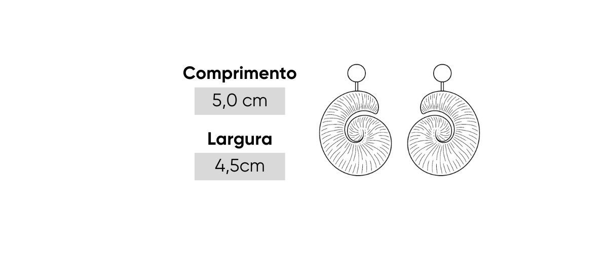 Produzido em metal dourado texturizado, o brinco tem acabamento fosco com leve brilho, valorizando o desenho e as ranhuras que lembram conchas naturais. É leve, confortável e possui um formato que se adapta bem ao rosto, trazendo equilíbrio entre ousadia e refinamento.