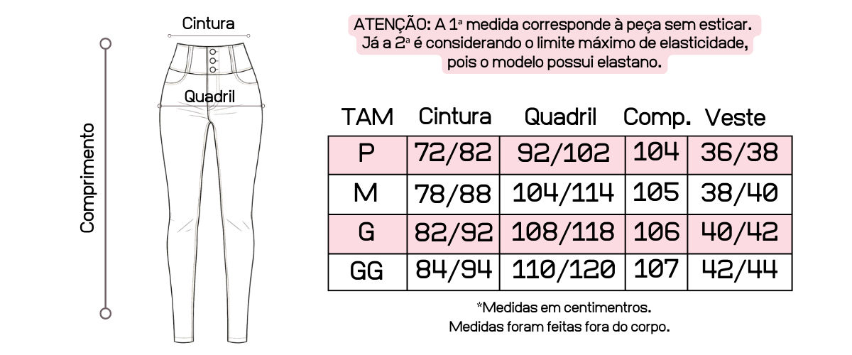 Atente-se as medidas na hora da compra para que receba a sua peça exatamente do tamanho que deseja