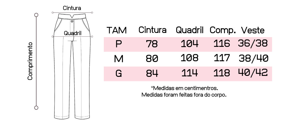 Atente-se as medidas na hora da compra para que receba a sua peça exatamente do tamanho que deseja