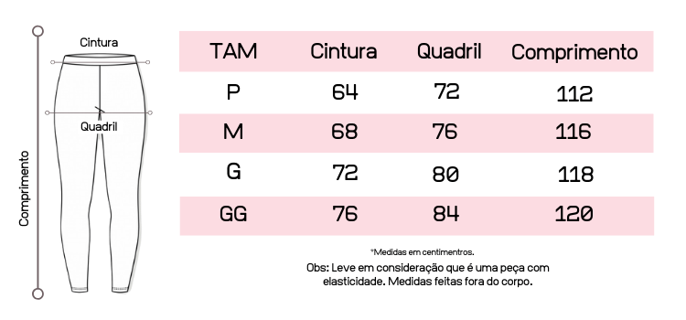 Seu modelo cintura alta possui corte reto, alongando e se ajustando ao corpo por possuir elastano em sua composição. Disponível do P ao GG.