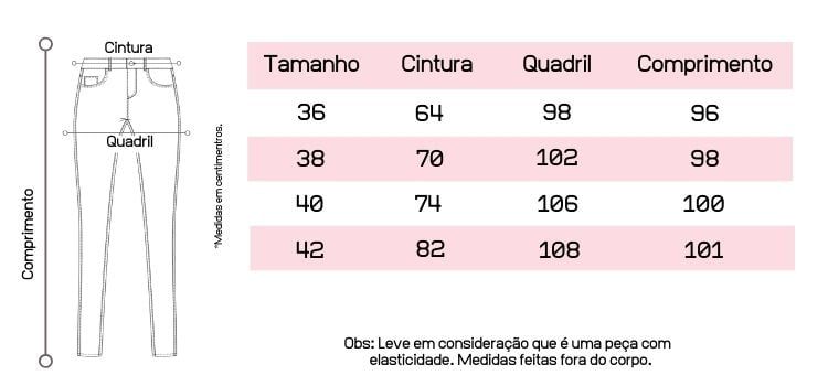 É um modelo de jeans sem elastano, ou seja, não possui nenhuma elasticidade. Indicamos estar olhando a tabela de medidas para escolher o tamanho ideal para você.
