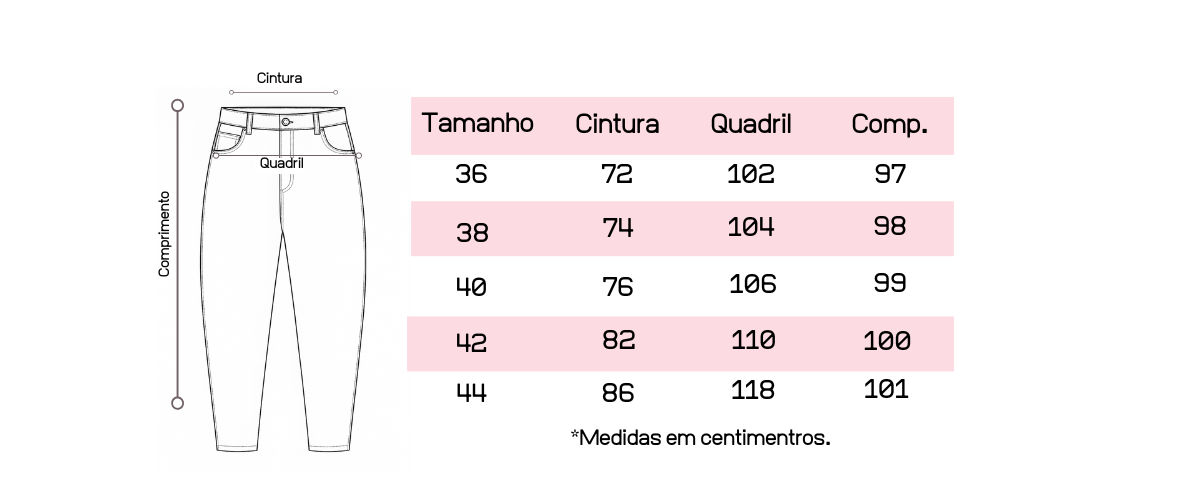 Atente-se as medidas na hora da compra para que receba a sua peça exatamente do tamanho que deseja