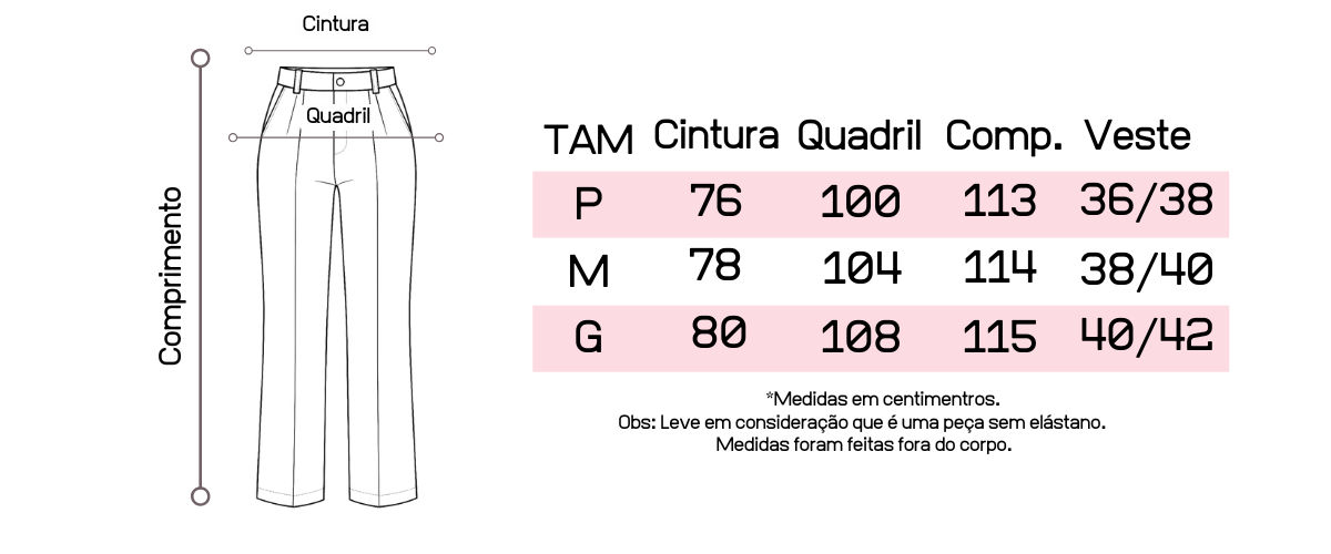 Atente-se as medidas na hora da compra para que receba a sua peça exatamente do tamanho que deseja