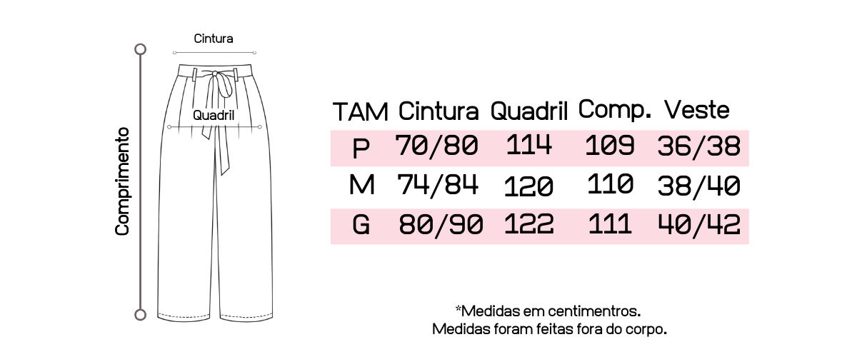 A modelagem pantalona apresenta pernas amplas desde o quadril até a barra, criando uma linha alongada e elegante que valoriza todos os biotipos. O cós alto com elástico embutido nas costas traz conforto total, ajustando-se ao corpo sem apertar.