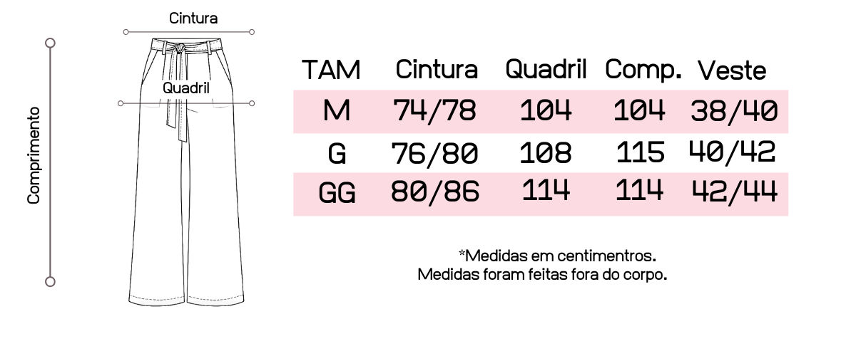 Atente-se as medidas na hora da compra para que receba a sua peça exatamente do tamanho que deseja
