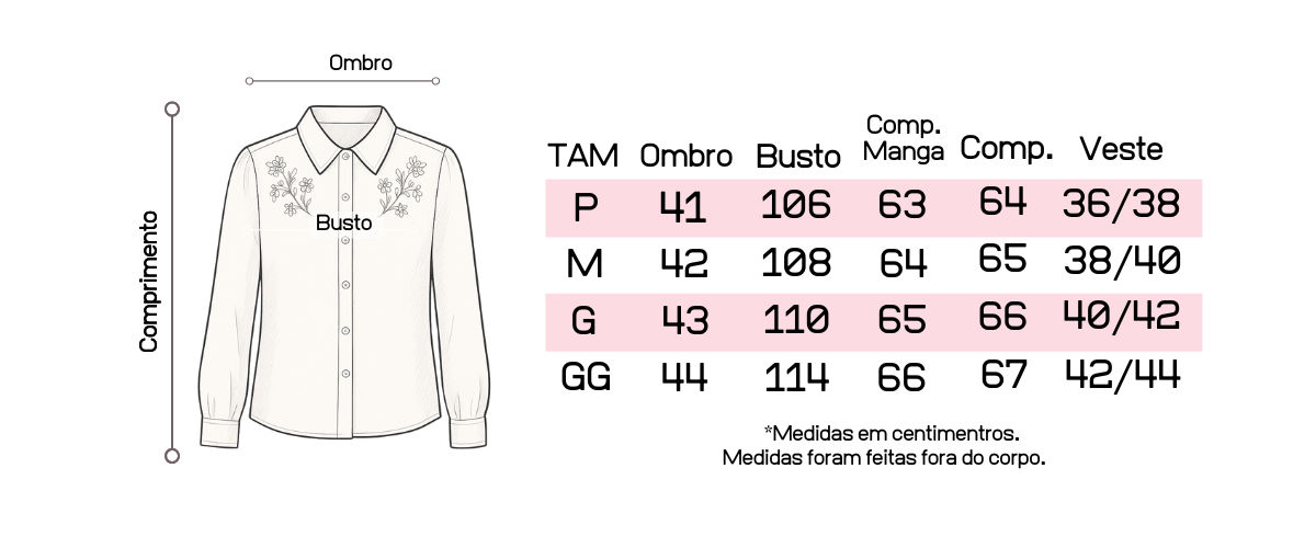 Recomendamos que tenha em mãos suas medidas de busto, cintura e quadril para que possa fazer a comparação com as medidas da peça, pois cada uma tem suas medidas tiradas exclusivamente.
