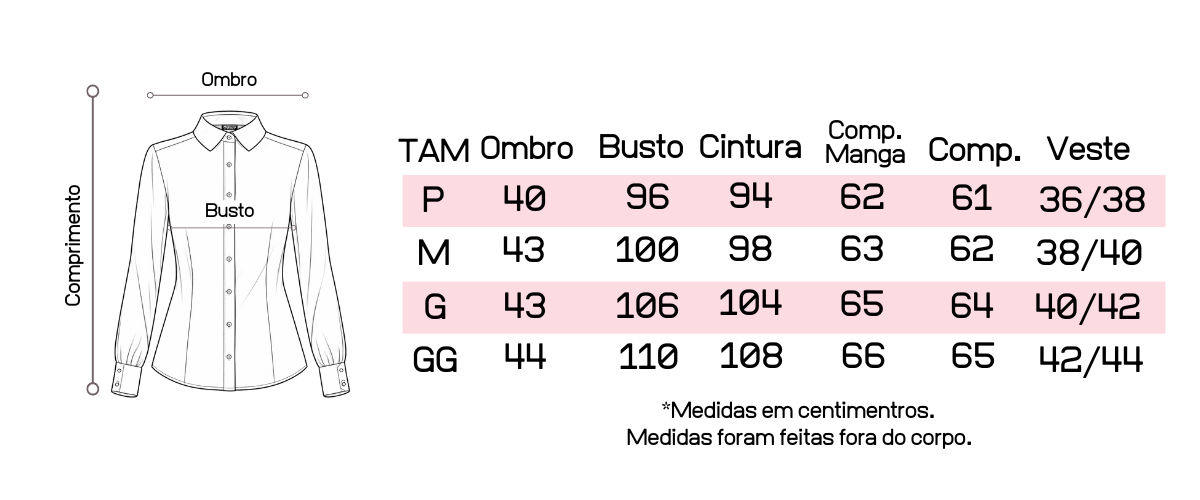 Recomendamos que tenha em mãos suas medidas de busto, cintura e quadril para que possa fazer a comparação com as medidas da peça, pois cada uma tem suas medidas tiradas exclusivamente.