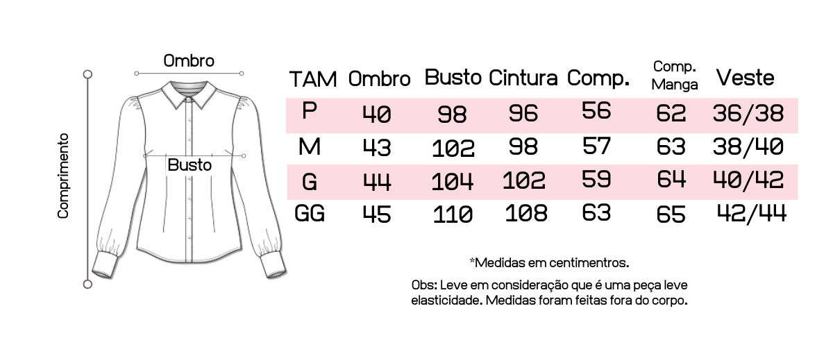 Atente-se as medidas na hora da compra para que receba a sua peça exatamente do tamanho que deseja
