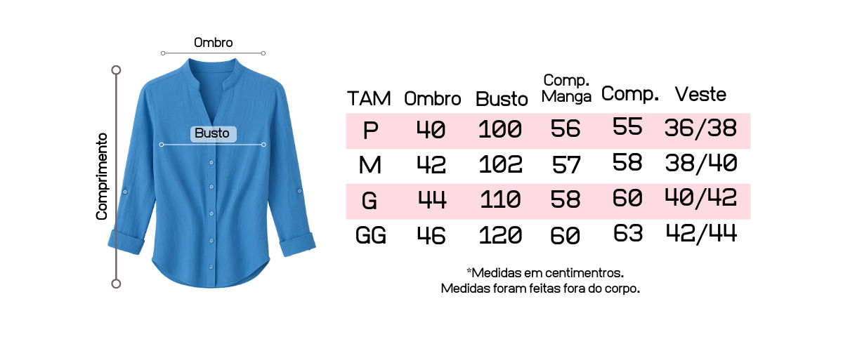 Atente-se as medidas na hora da compra para que receba a sua peça exatamente do tamanho que deseja