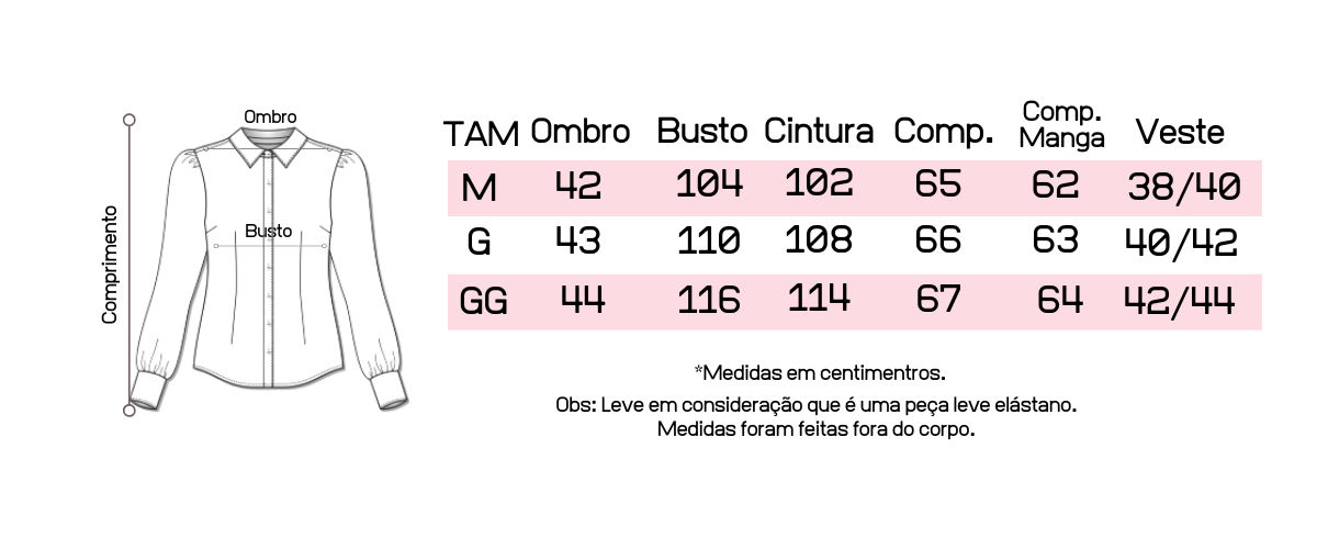Atente-se as medidas na hora da compra para que receba a sua peça exatamente do tamanho que deseja