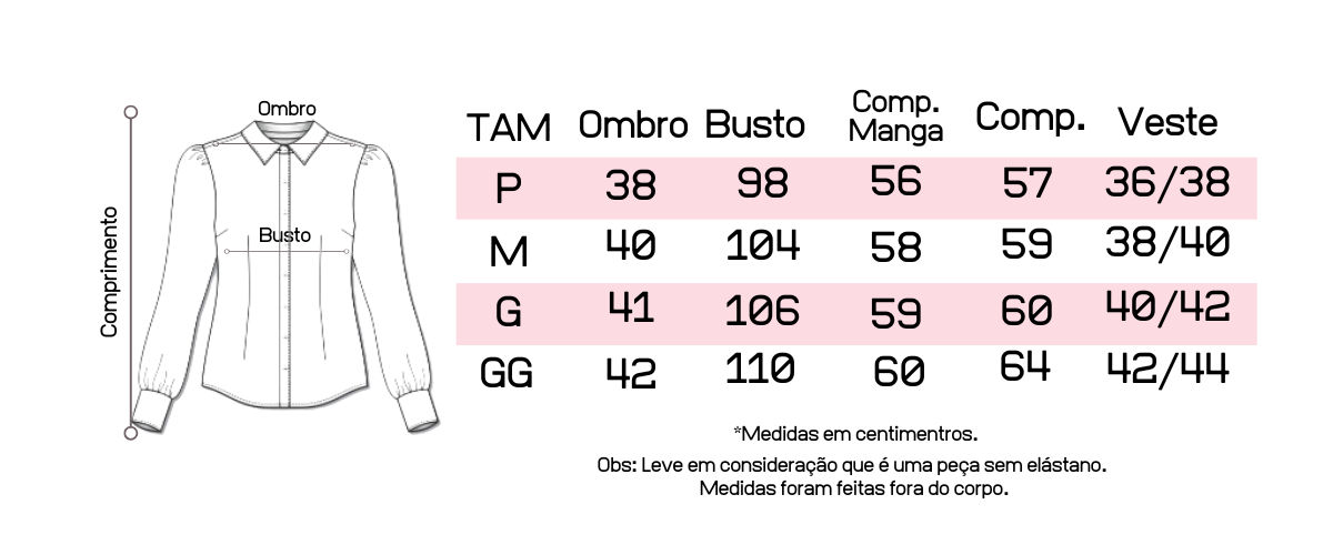 Atente-se as medidas na hora da compra para que receba a sua peça exatamente do tamanho que deseja