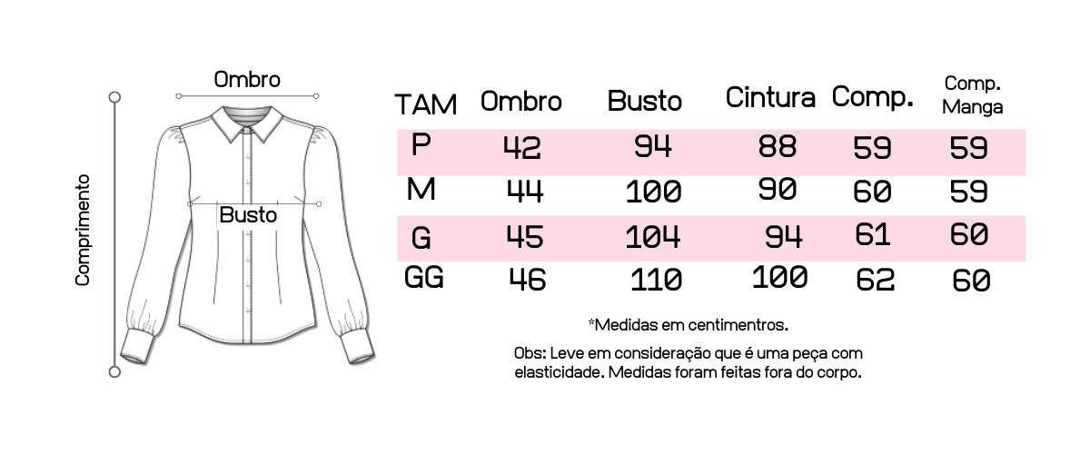 Atente-se as medidas na hora da compra para que receba a sua peça exatamente do tamanho que deseja