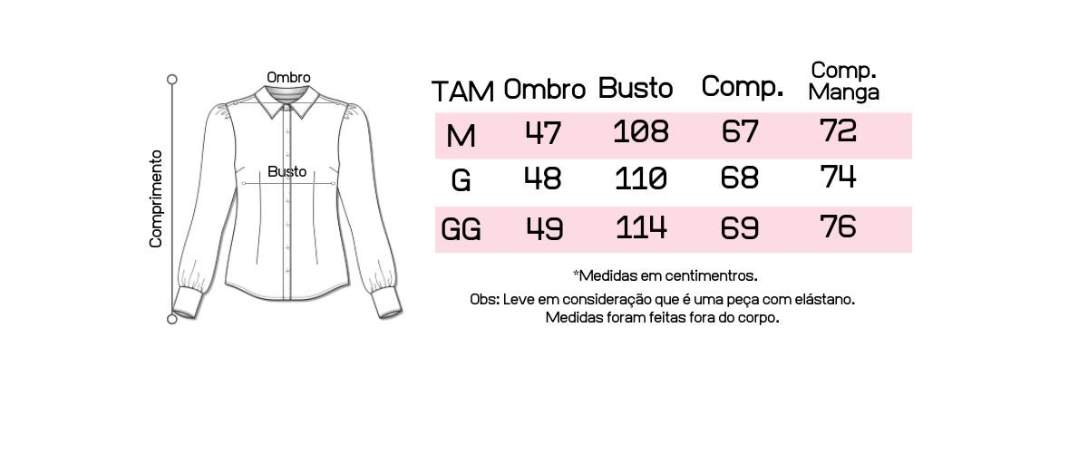 - Modelagem grande e solta ao corpo, confira as medidas abaixo!