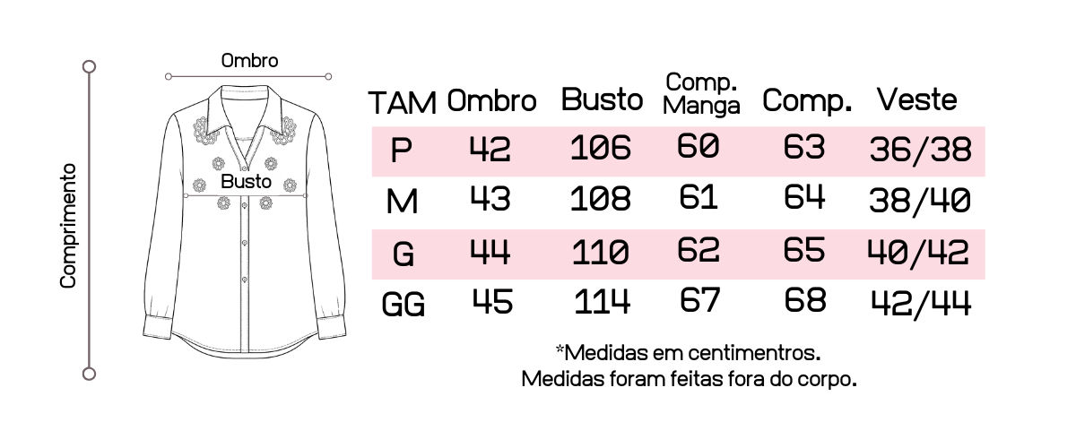 Recomendamos que tenha em mãos suas medidas de busto, cintura e quadril para que possa fazer a comparação com as medidas da peça, pois cada uma tem suas medidas tiradas exclusivamente.