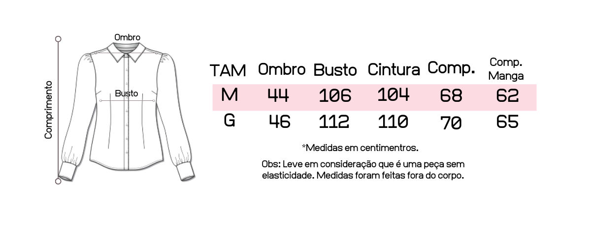 - Pode ser levemente transparente, ideal usar um sutiã cor da pele por baixo ou então montar uma sobreposição com uma regata ou body; (Sugerimos nosso Body Carmen ou Regata Alexia)