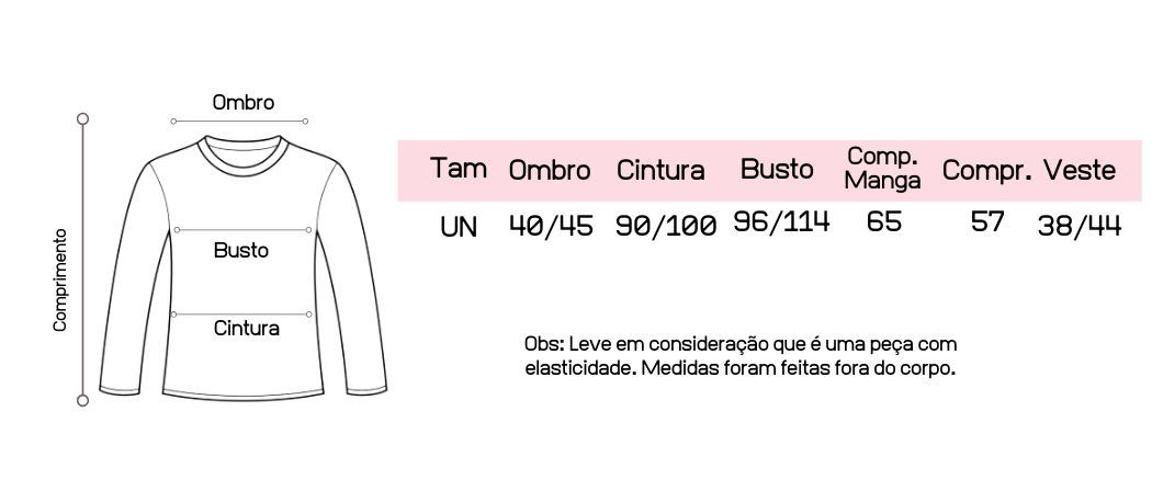 | Tecido | Tricot; Modelagem que se ajusta no corpo; Tamanho único, veste do 38 ao 44. |