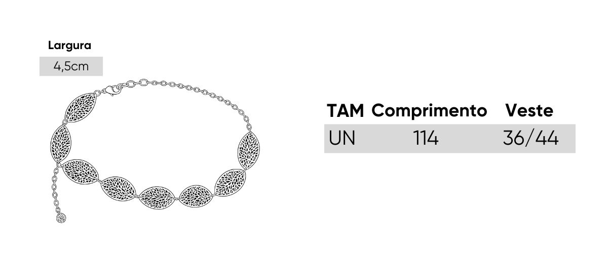 O design é moderno, com acabamento polido que reflete a luz de forma sutil, valorizando a cintura com charme. Possui fecho tipo mosquetão e corrente ajustável, permitindo adaptar ao tamanho desejado e usar tanto sobre vestidos, saias ou calças, quanto para marcar a silhueta em peças mais soltas.