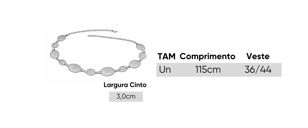 Possui fechamento por mosquetão com corrente extensora, permitindo ajuste confortável e versátil na cintura ou quadril. O brilho do dourado valoriza a produção e transforma looks básicos em composições elegantes e marcantes.