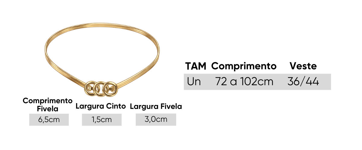 Cinto metálico em acabamento dourado com design moderno e elegante. Possui estrutura maleável em formato de mola, que se ajusta ao corpo com conforto sem marcar, valorizando a cintura de forma sofisticada. O destaque fica para o fecho frontal composto por três argolas circulares entrelaçadas, que trazem um visual contemporâneo e refinado ao acessório.