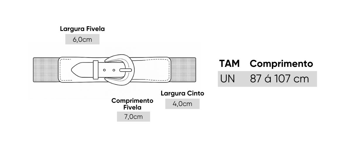 | Composição | Fivela 100% Metal - Elástico em Poliuretano |