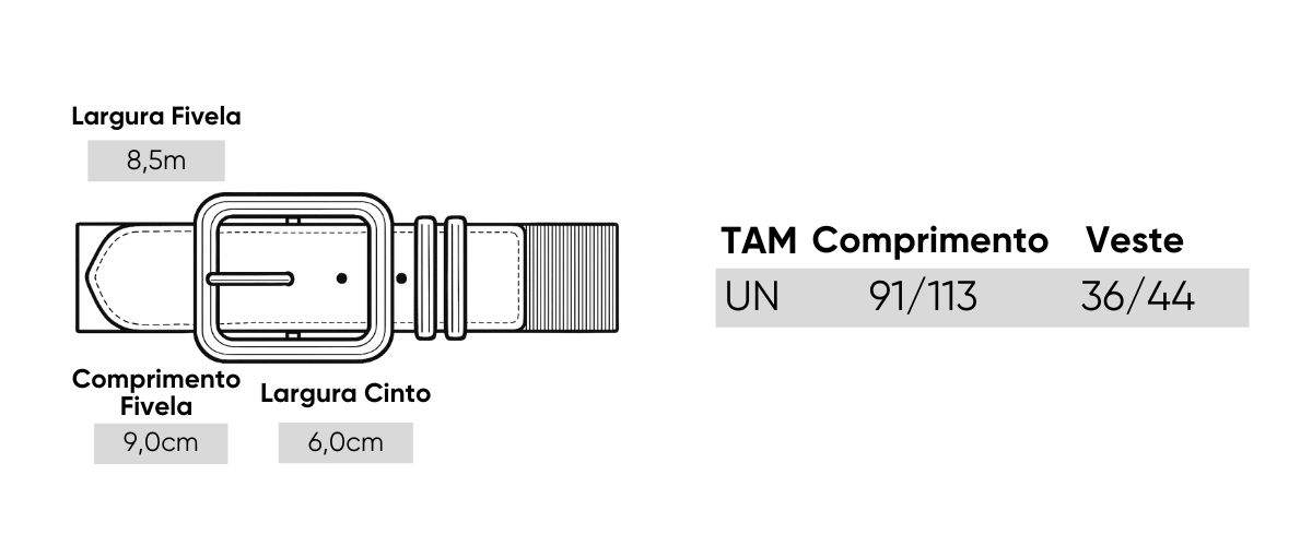 | Composição | Fivela 100% Metal - Elástico em Poliuretano |