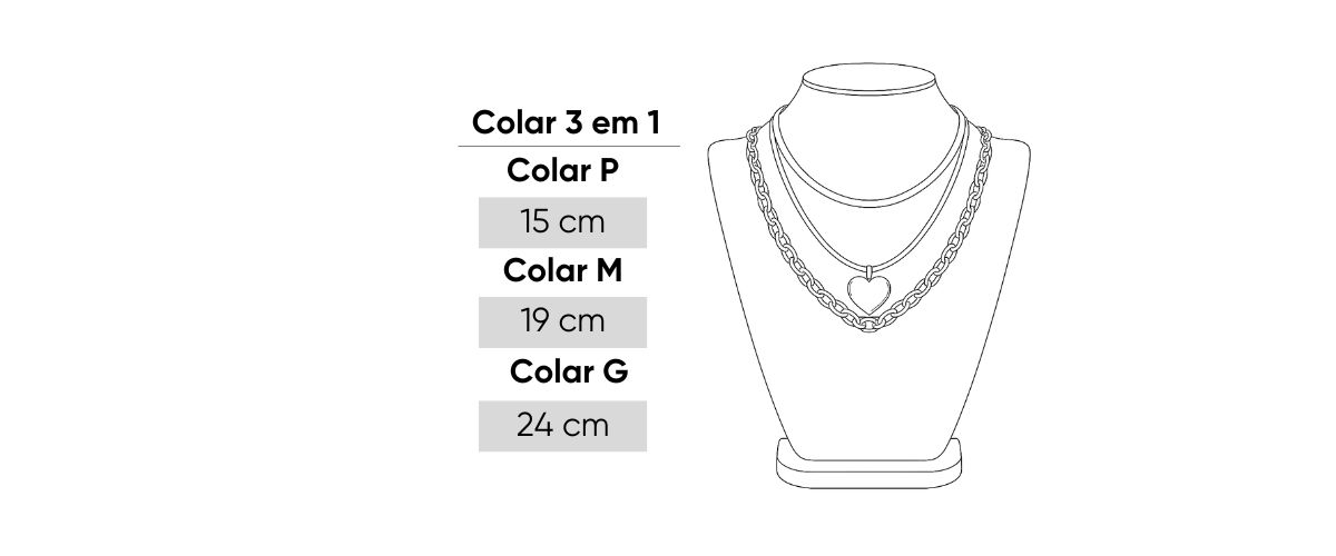 O design apresenta uma corrente tipo elos, uma corrente lisa tipo fita e uma corrente fina com o pingente de coração central, que cria o ponto de luz perfeito para o colo. As camadas possuem alturas ajustadas, proporcionando um caimento equilibrado e sofisticado.