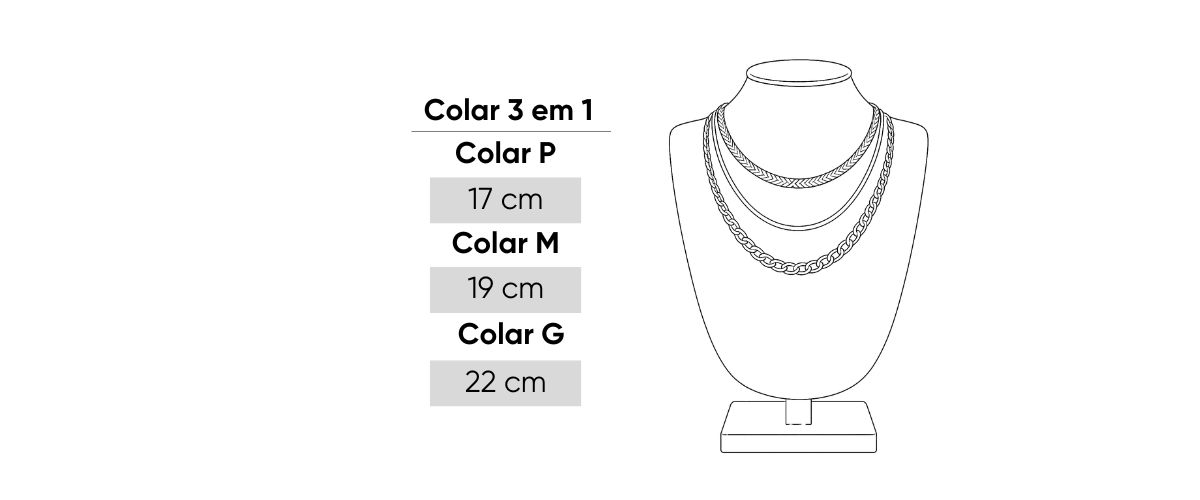 A peça é composta por uma corrente tipo espinha de peixe, uma corrente lisa tipo fita e uma corrente de elos médios, criando um visual equilibrado entre o delicado e o imponente.