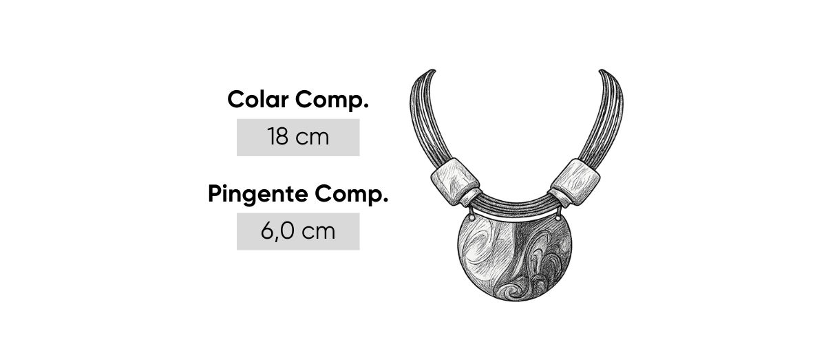 A composição traz várias cordas revestidas, que criam uma base firme e visualmente rica, realçada por dois elementos geométricos quadrados em resina perolada e um maxi pingente central em formato semicircular, de resina translúcida com efeito marmorizado — um toque artístico e sofisticado.