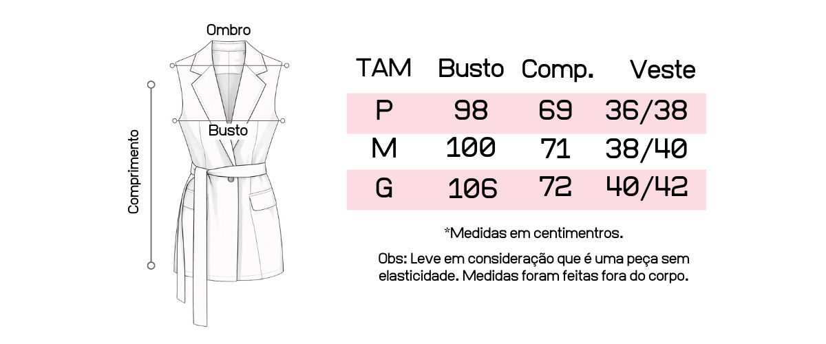 Possui faixa de amarração, que permite ajustar na cintura, deixando a peça mais acinturada e valorizando o corpo.
