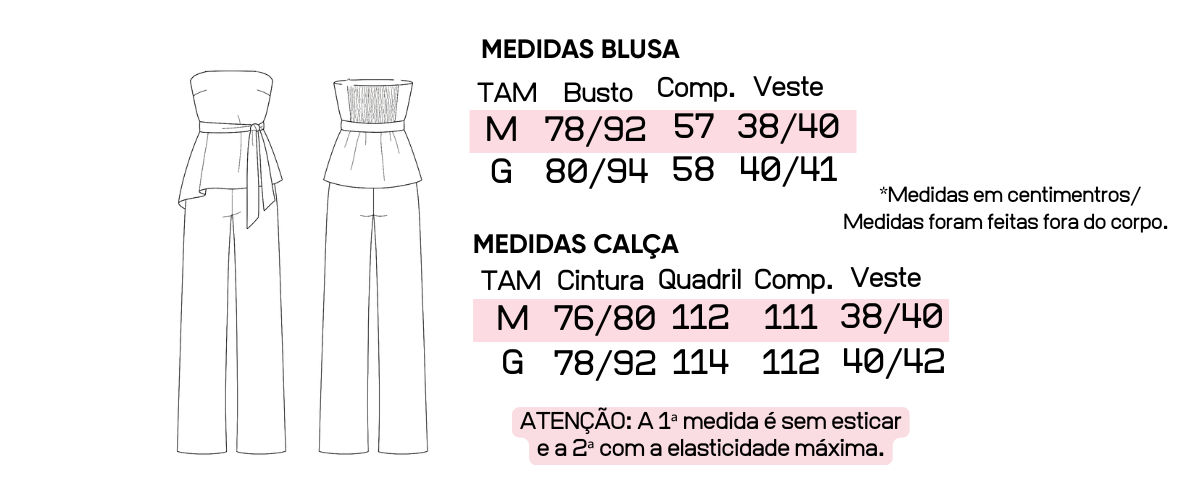 Recomendamos que tenha em mãos suas medidas de busto, cintura e quadril para que possa fazer a comparação com as medidas da peça, pois cada uma tem suas medidas tiradas exclusivamente.