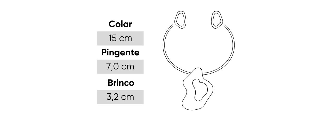 A choker possui estrutura rígida e anatômica, com pingente central em formato assimétrico e vazado, criando um efeito escultural e contemporâneo. Os brincos seguem o mesmo conceito, apresentando formato geométrico irregular e leve, que complementa o colar com harmonia e estilo.