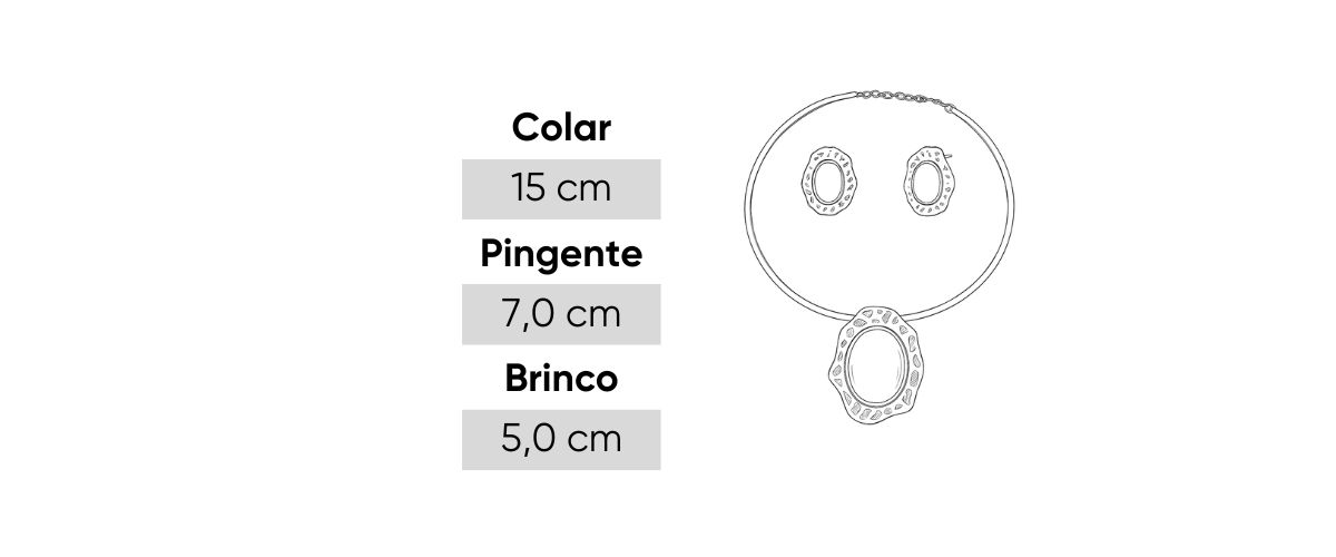 O Conjunto Clara une elegância e modernidade em um design marcante. Composto por colar rígido tipo choker e brincos coordenados, o conjunto traz o equilíbrio perfeito entre o metal polido e a pedra oval central translúcida, que reflete a luz com delicadeza e charme.