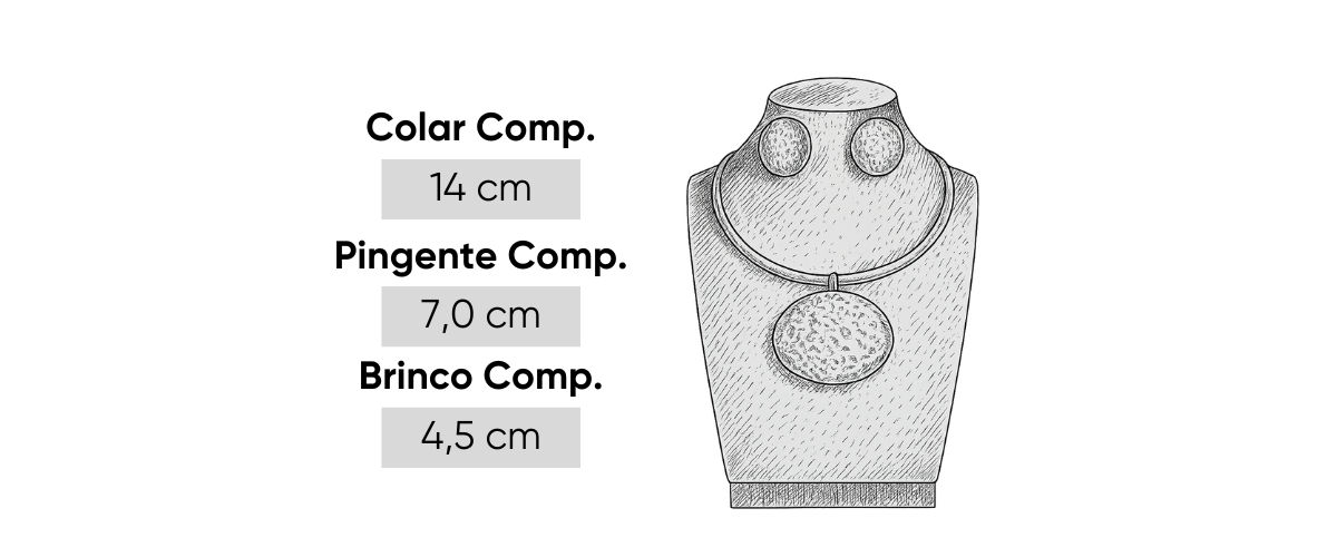 Acompanha brincos redondos com o mesmo efeito martelado, formando um conjunto harmonioso e contemporâneo.