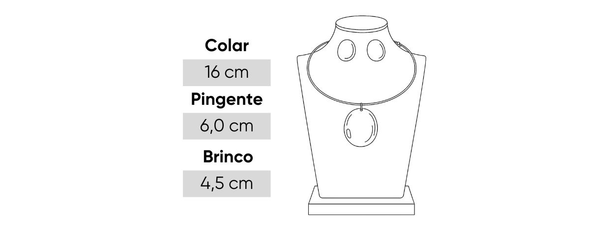 O colar rígido traz um design limpo e delicado, destacando o pingente oval polido, que reflete a luz com naturalidade. Os brincos seguem o mesmo formato, criando uma composição equilibrada e impactante — perfeita para quem busca uma peça de destaque com acabamento impecável.