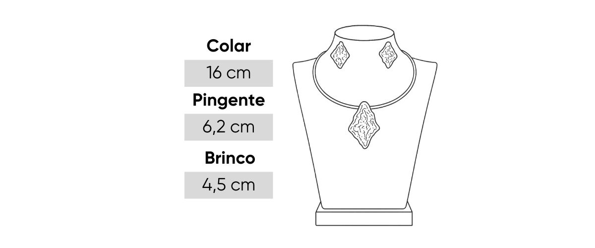 O colar rígido possui estrutura delicada e firme, destacando o pingente em formato geométrico irregular, com textura martelada e efeito metálico de alto brilho. Os brincos seguem o mesmo desenho, criando um conjunto harmonioso e de presença marcante.